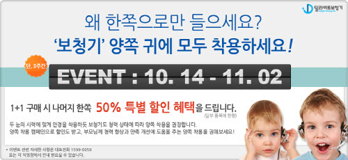 딜라이트㈜가 보청기 양쪽 착용 캠페인의 일환으로 일정 기간 동안 양쪽 착용 프로모션을 진행한다. 보청기 양쪽 착용 프로모션은 양쪽 구매 시 나머지 한쪽을 최대 50% 할인해주는 특별 이벤트다. 프로모션 기간은 11월 2일까지다.(일부 모델 한정)