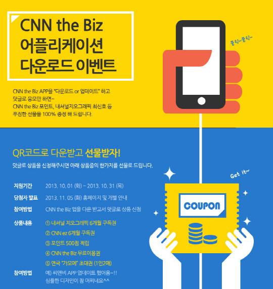 이번 이벤트는 CNN the Biz 애플리케이션을 휴대폰에 다운로드 받은 후, CNN the Biz 홈페이지 이벤트 페이지에 댓글을 작성해 응모하면 추첨을 통해 다양한 상품을 증정한다.