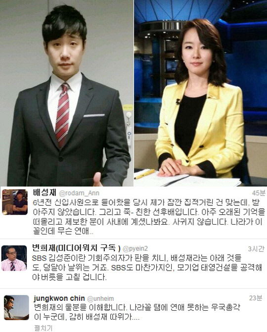 앞서 이날 배성재 아나운서와 박선영 아나운서의 열애설이 제기되자, 배 아나운서는 자신의 트위터에 열애설을 해명하며 "나라가 이 꼴인데 무슨 연애.."라는 글을 남기며 열애설을 부인했다.