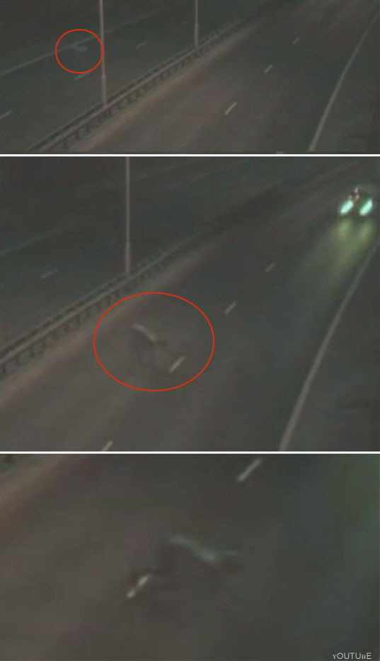 게재된 영상 속에는 정체불명의 괴생명체가 한밤중에 고속도로를 빛의 속도로 빠르게 지나가는 모습이 포착됐다. 이 괴생명체는 속도가 빨라 얼핏 동물로 보이지만, 확대해 자세히 보면 엎드려 길을 건너는 자세가 사람과 비슷해 늑대인간이 아니냐는 추측도 제기되고 있다.