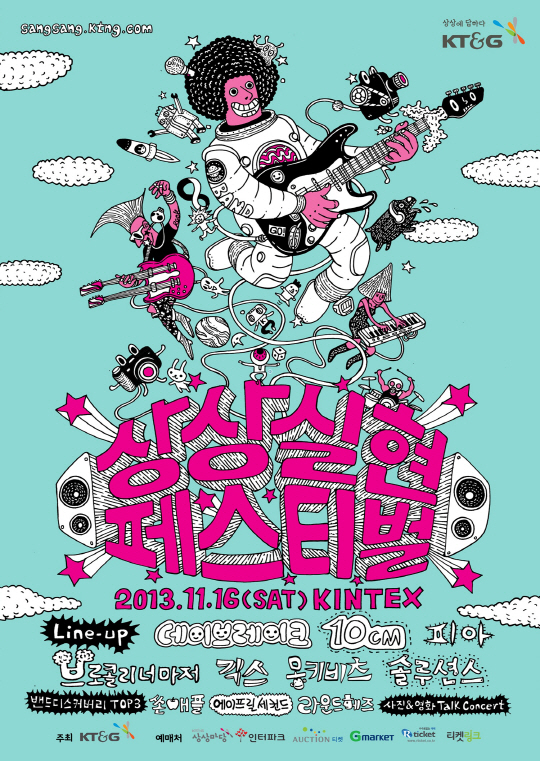 KT&G는 음악, 사진, 영화 세 분야에서 선발된 신인들이 선배 아티스트들과 함께 꾸미는 상상실현 페스티벌을 오는 11월 16일 경기도 고양시에 위치한 킨텍스에서 개최한다.