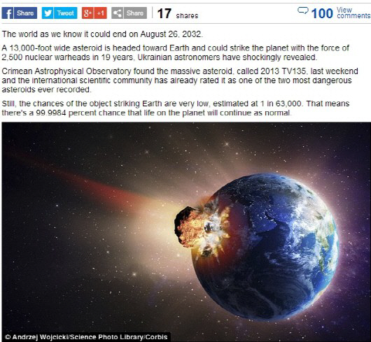 지난 17일(한국시간) 데일리 메일 등 외신은 "우크라이나 크림 반도에 자리한 크림 천문대 측은 '2013 TV135'라고 이름 붙인 약 4000m 너비의 거대 소행성을 지난주 발견했으며, 이 소행성이 오는 2024년 지구와 근접해 2032년 8월 26일이면 지구와 충돌할 가능성이 있다"고 보도했다.
