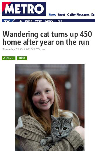 집을 나간 고양이가 1년만에 약 725km 떨어진 곳에서 발견돼 화제다.