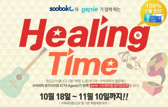 비상교육의 중학생 대상 인터넷강의사이트 수박씨닷컴(www.soobakc.com)은 2학기 중간고사 후 심신이 지쳐있을 중학생들을 위해 음악사이트 KT지니와 함께 100회 무료 음악감상권을 증정하는 '힐링타임 이벤트'를 펼친다고 21일 밝혔다.