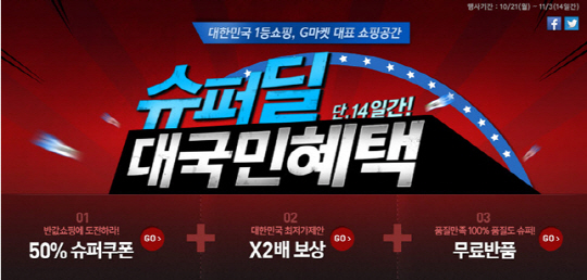 G마켓은 리뉴얼을 기념해 오는 11월 1일까지 '오늘의 슈퍼딜' 14개 상품을 대상으로 온라인 쇼핑 최저가 보상제를 실시한다. 당일 오전 10시부터 익일 10시까지의 노출상품에 대해 타 온라인쇼핑몰 비교 하여 최저가가 아닐 경우 차액의 2배를 G마켓에서 현금처럼 쓸 수 있는 G캐시로 적립해준다. 비교가격은 상품가격에서 할인쿠폰이나 혜택을 제외한 최종구매 가격 기준이다.