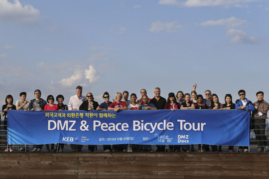 외환은행(은행장 윤용로 / www.keb.co.kr)은 지난 20일 미국, 독일, 캐나다 등 10여개 국가의 외국인 고객(Expat)과 외환은행 직원이 함께 우리나라 비무장지대(DMZ)를 방문하고 인근 임진각 평화누리공원에서 파주시 마정리에 이르는『외국인 고객과 외환은행 직원이 함께하는 DMZ & 평화자전거 Tour』 행사를 실시했다고 21일 밝혔다.