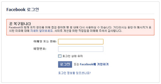 현재(오후 10시 기준) 페이스북 로그인 시 "곧 복구됩니다. 페이스북이 현재 유지 관리를 위해 점검 중이며 몇 분 내에 다시 사용하실 수 있습니다. 사이트 개선을 위한 작업임을 이해해 주셔서 감사합니다"라는 메시지가 안내되고 있다.