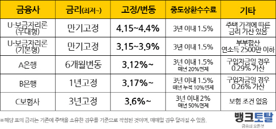 이달 기준으로 아파트담보대출 최저금리(대환 기준)가 가장 낮은 곳은 A은행으로 6개월 변동 3.12%이며, B은행도 1년 주기 고정으로 3.17%까지 가능하다. 고정금리의 경우 3년 고정으로 C보험사가 3.6%까지 가능하다.