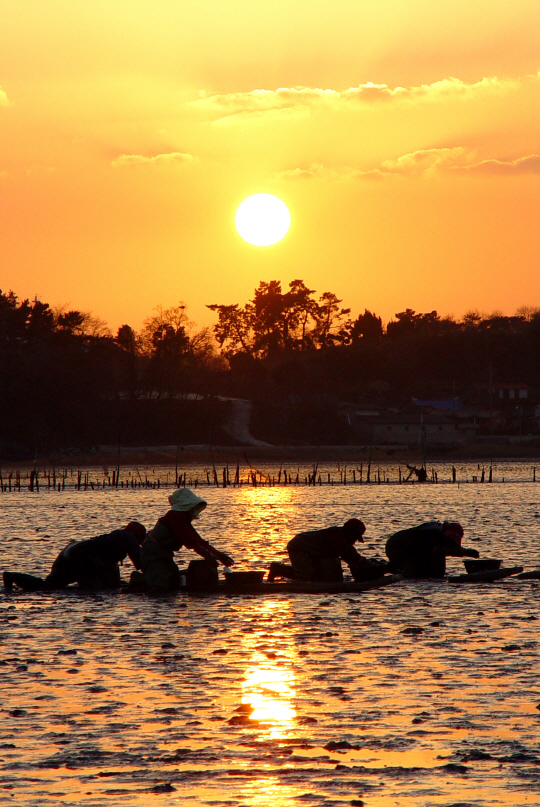 해질녘 꼬막 채취를 마치고 뻘배를 밀며 포구로 귀환하는 모습.