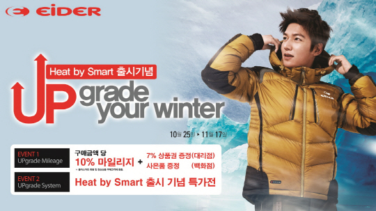프랑스 아웃도어 브랜드 아이더(www.eider.co.kr)는 올 하반기 아웃도어 시장을 적극 공략하기 위해 다운 재킷 기능성 시스템인 '히트 바이 스마트 시스템(Heat by Smart system)'을 런칭했다. 그리고 이를 기념해 오는 10월 25일부터 11월 17일까지 '업그레이드 유어 윈터(Upgrade your winter)' 이벤트를 진행한다.