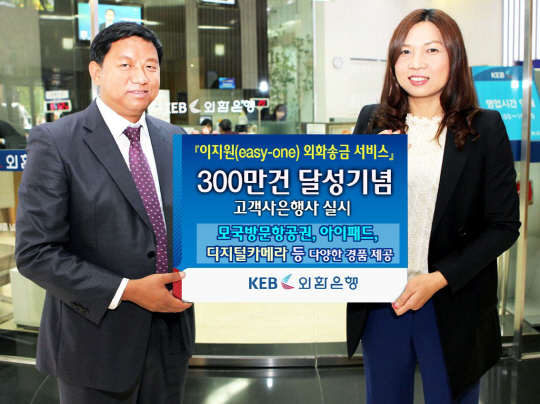 외환은행(은행장 윤용로/www.keb.co.kr)은 'easy-one외화송금서비스'의 해외송금 300만건 달성을 기념하는 고객감사 경품사은행사를 10월24일부터 12월31일까지 실시한다고 밝혔다.