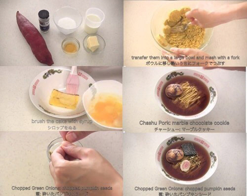 라면의 면 부분은 스위트 감자(고구마)를 으깨고 뭉친 후 잘라 만든 것. 오뎅 고명은 화이트 및 딸기 초콜릿으로 표현해 냈다. 또한 우유와 계란, 젤라틴 그리고 스펀지케이크 등의 재료를 이용해 라면 같은 케이크를 완성해냈다.<스포츠조선닷컴>
