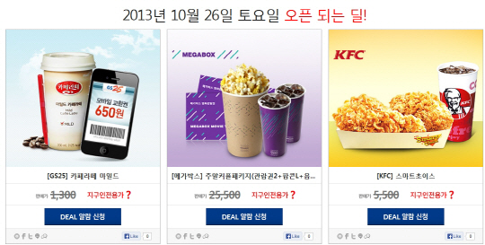 주말 첫 딜이 진행되는 26일(토) 오전 9시에는 편의점 인기 상품인 'GS25 카페라떼 마일드'를 50% 할인된 지구인 전용가 650원에 판매한다. 편의점 세븐일레븐과 바이더웨이에서 사용 가능한 '빙그레 바나나우유'는 53% 할인율이 적용된 600원에 구매할 수 있다. 27일에는 'GS25 웰치스 포도맛'과 '나뚜루 팝싱글컵'을 각각 500원, 2200원에 선보인다.