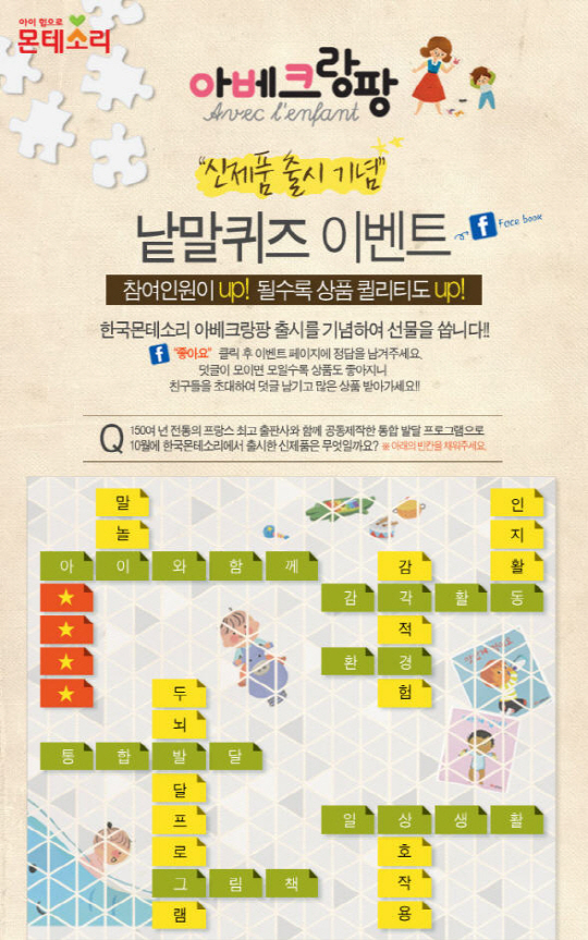 한국몬테소리는 150년 전통의 프랑스 최고 출판사와 공동으로 제작한 신제품 "아베크랑팡" 출시를 기념하여 10월 28일부터 11월 20일까지 몬테소리 페이스북(www.facebook.com/kr.montessori)을 통해 이벤트를 실시한다.