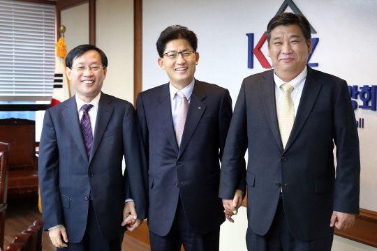 상생협력기구 설립준비위원회(왼쪽 네이버 김상헌 대표이사, 가운데 중소기업중앙회 송재희 부회장, 오른쪽 소상공인연합회 창립준비위원회 최승재 위원장)