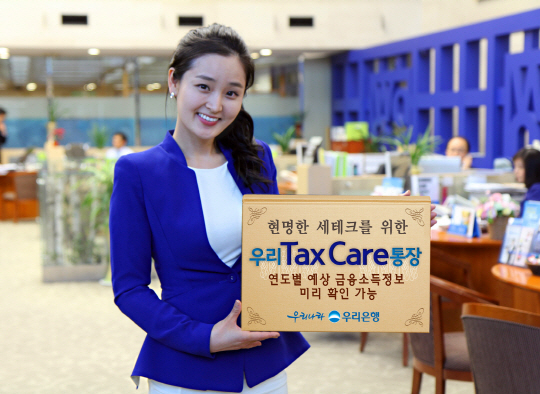 우리 Tax Care 통장은 우리은행에서 가입한 금융상품에 대해 원천징수되는 금융소득을 연도별로 누적 집계하여 알려주는 입출식 통장이다. 예적금 가입고객에 대해서는 만기 이자수익을, 펀드와 같은 시가상품에 대해서는 전일까지 계산된 배당수익에 대해 연도별로 합산하여 알려주는 상품이다. 예상 과세소득은 가까운 영업점이나 인터넷뱅킹에서 쉽게 확인이 가능하다. 예상 금융소득 정보와 세제상품별 가입한도 확인을 통해 세테크를 할 수 있다.
