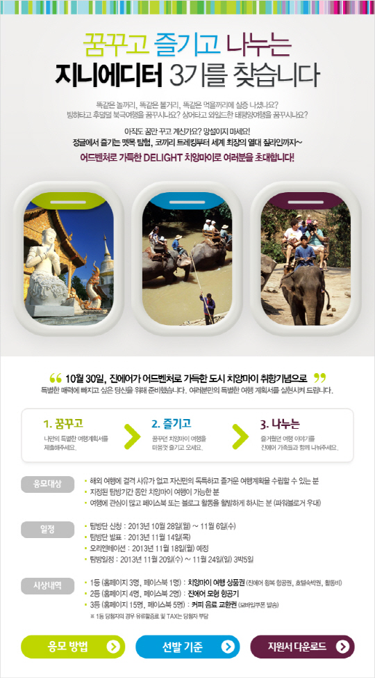 진에어는 "이번 치앙마이 탐방단은 여행 테마의 독창성, 실행 가능성, 흥미성 등을 엄밀히 심사해 선발할 예정"이라며 "지니에디터의 여행 후기는 치앙마이의 여행 정보를 소개하는 동시에 다양한 컨텐츠가 담긴 온라인 여행 가이드북 같은 역할을 담당할 것"이라고 말했다.