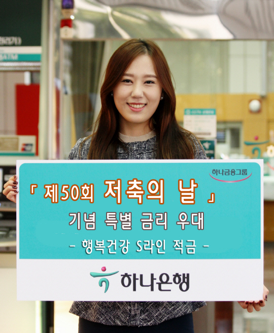 하나은행(은행장 김종준, www.hanabank.com)은 29일 제 50회 「저축의 날」을 기념하여 29일부터 11월 15일까지'하나 행복건강 S라인적금'가입 고객들에게 특별 우대금리를 제공한다고 밝혔다.