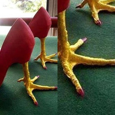 이 게시물에는 빨간색 하이힐 한 켤레의 모습이 담겨있다. 그러나 하이힐을 자세히 보면 평범한 듯 보이나, 굽 부분이 닭발 모양으로 만들어져 있는 것이 특징이다.