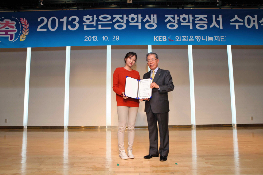 외환은행나눔재단(이사장 윤용로, www.kebfoundation.com)은 지난 29일 을지로 외환은행 본점 4층 대강당에서 국내 저소득층 가정 우수학생을 대상으로 2013년도 '환은장학생'을 선발하고 이들에 대해 장학금을 수여하는 2013 환은장학금 수여식을 개최하였다고 30일 밝혔다.