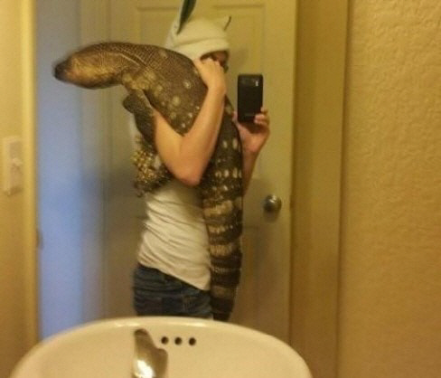 공개된 사진 속에는 한 남성이 거울 앞에 서서 도마뱀을 어깨에 걸친 채 자신의 모습을 담고 있다.