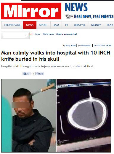 의료진은 "정밀 조사 결과 칼날이 그의 두개골을 뚫고 뇌의 한 쪽 부분에 박혀 있었다"며 "다행히 칼날이 주요 혈관을 건드리지 않았다"고 밝혔다.