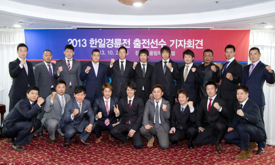 ◇양국선수들이 한-일경륜전을 앞두고 기자회견을 가진 뒤 선전을 다짐하는 파이팅을 외치고 있다.