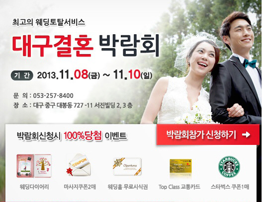 대구 중구 대봉동 727-11 서전빌딩 2, 3층에서 11월 8일부터 3일간 진행되는 이번 웨딩박람회는 대구 결혼박람회 홈페이지(http://weddfair.co.kr)와 대구 웨딩협회 홈페이지(www.wedd.co.kr)에서 사전 신청 후 무료로 참여할 수 있다.