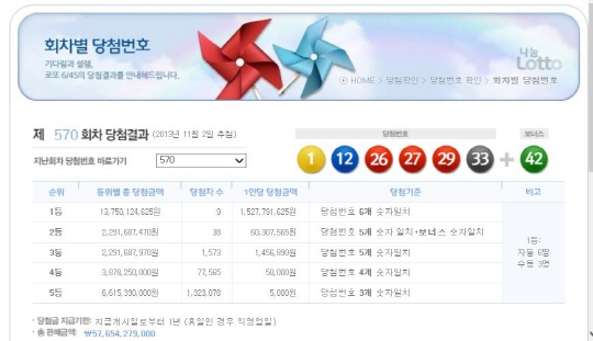 2일 제570회차 로또복권을 추첨한 결과, 1등에 당첨된 사람은 총 9명으로 각각 15억2779만원을 받게됐다.
