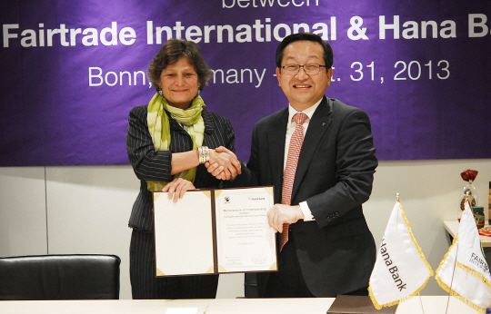 하나은행(은행장 김종준,www.hanabank.com)은 지난달 31일 독일 본(Bonn) 국제공정무역인증기구(Fairtrade Labelling Organization International, 이하 FLO) 본사에서 공정무역 발전을 위한 MOU를 체결하였다고 밝혔다.