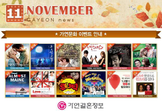 뮤지컬 '풍월주'(~11월 28 일까지 이벤트 진행)는 뇌리에 각인되는 애달픈 음악을 더한 아련한 스토리의 작품이며 '뮤직쇼 웨딩'(~11월 25일까지)은 화려한 퍼포먼스와 귀를 황홀하게 할 뮤직 파티쇼로 각각 가연 회원 10쌍을 추첨해 초대권을 제공할 예정이다. 일상에 지치고 힘들 때 힘이 되어줄 활력소 같은 뮤지컬 '메디컬 루나틱'(~11월 25일까지)과 각양각색으로 빛나는 9가지의 로맨틱 스토리를 담은 연극 'ALMOST MAINE'(~11월 24일까지), 본격 심리 추적 스릴러 연극 '술래잡기'(~11월 19일까지)', 부부의 바람이 격돌한 아슬아슬한 숨바꼭질 연극 '바람과 함께 사라지다'(~11월 24일까지)', 짝사랑으로 지친 이들을 위한 로맨틱 연극 '스틸하트'(~11월 25일까지)', 내 이야기 같은 공감 가는 연애 공식을 담은 연극 'Love Actually'(~11월 24일까지) 등도 모두 추첨을 통해 각각 가연 회원 10쌍씩을 초대한다.