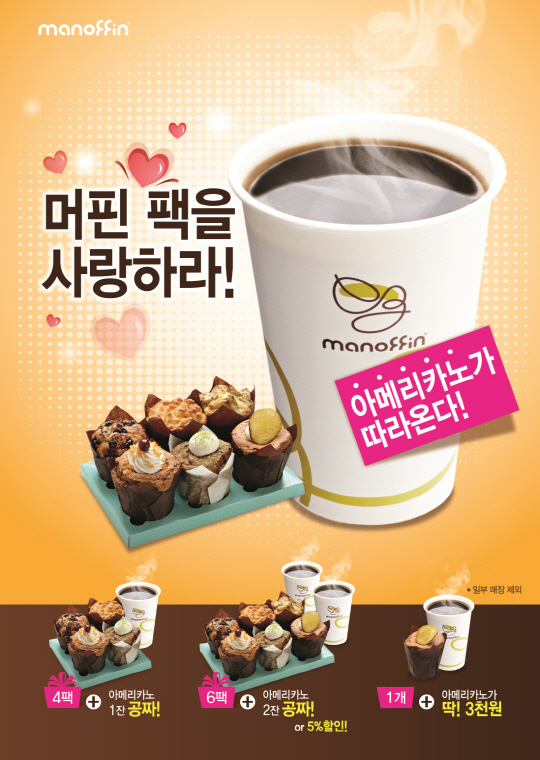 마노핀은 이번 이벤트를 통해 머핀 4개팩 구매시 아메리카노 1잔 6개팩 구매시 2잔을 무료로 증정한다. 또 머핀 1종과 아메리카노 1잔 세트를 구입하면 정상가보다 1000원 가량 할인된 3000원에 판매할 예정이다.