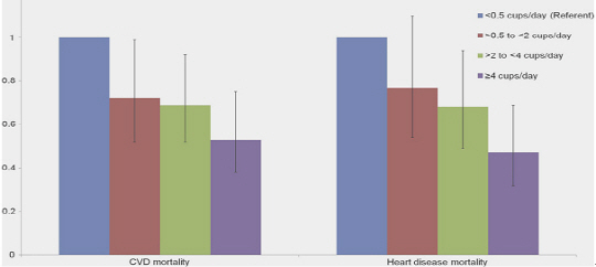심장혈관의 입장에서는, 커피 소비는 비만과 우울증을 줄일 뿐 아니라 2형 당뇨와 고혈압의 빈도를 줄인다. 물론 이런 효과는 음료가 어떠한 비중으로 만들어졌는지에 따라 달라질 수 있지만, 최근 나오는 논문들에서는 습관적인 커피 소비가 관상동맥질환, 심부전, 부정맥 그리고 중풍의 위험도를 줄인다는 결과들을 발표하고 있다. 더 나아가 대규모의 역학조사에서는 심혈관계 사망률뿐 아니라 모든 원인 사망률을 낮춘다고 말하였다.