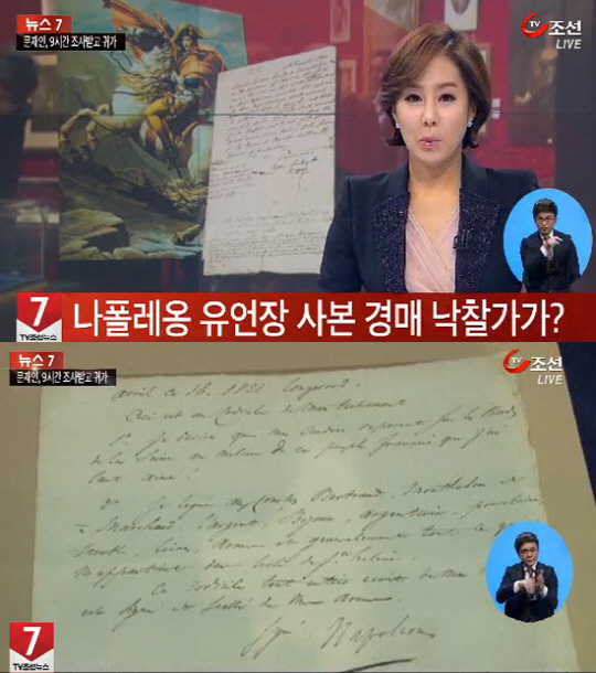 나폴레옹 유언장 사본은 35만 7000유로(약 5억1000만원)에 팔렸으며, 한 프랑스인이 이를 샀다. 유언장 사본은 나폴레옹이 유배 중이던 1821년 그를 가까이서 보필하던 몽톨롱 백작이 나폴레옹을 대신해 작성한 것으로 알려졌다.