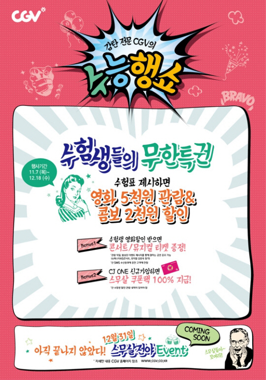 또 멀티플렉스 체인 CGV는 '수능행쇼' 이벤트를 연다. CGV는 수능이 끝나는 7일 부터 12월 18일까지 '수험생 무한특전 이벤트'로 수험생만을 위한 특별 혜택을 제공한다. 이벤트 기간에 현장 매표소와 매점에서 수험표를 제시하면 영화를 5000원에 관람하고 콤보는 2000원 할인 받을 수 있다.