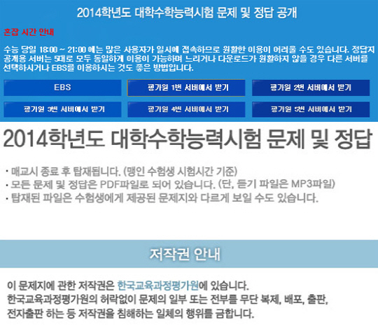 수능 문제 및 정답은 EBS 홈페이지 및 한국교육과정평가원(서버1~서버5)을 통해 다운 받을 수 있다.