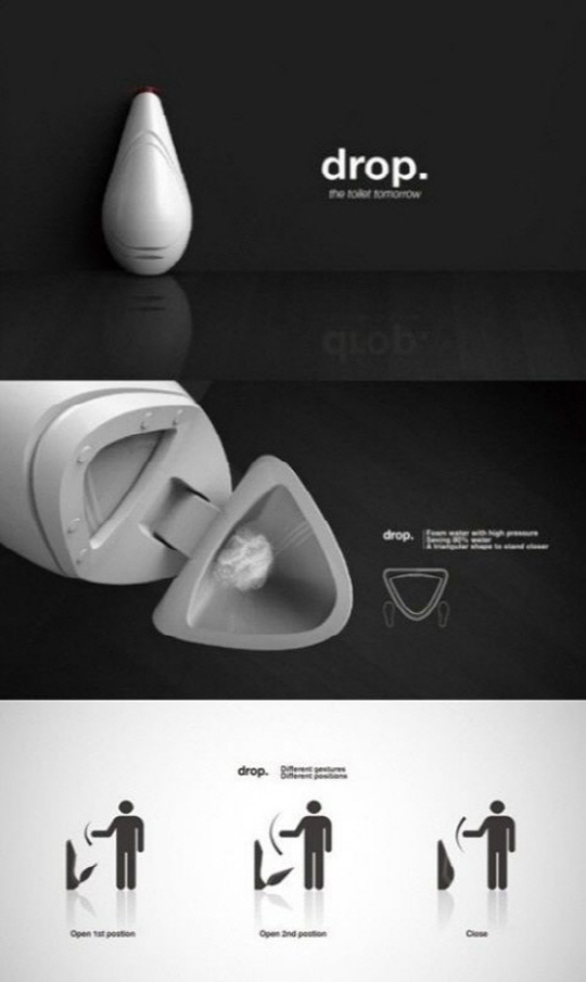 미래의 화장실은 일반 변기와 달리 물방울의 형태로, 이 변기에는 센서가 달려있어 평상시에는 밀폐된 형태로 있다가 사람의 손짓에 따라 소변기, 혹은 좌변기로 변신하는 기능이 특징이다.