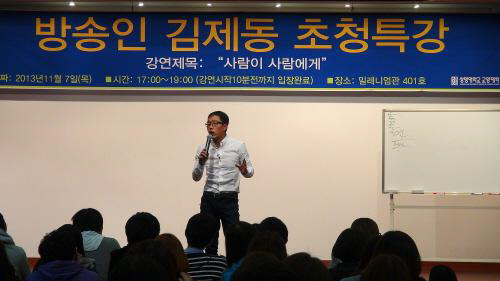 상명대(총장 구기헌)는 2013학년도 대학교육역량강화지원사업의 일환으로 시행하는 인문학특강에서 방송인 김제동씨가 7일 오후 5시 상명대 밀레니엄관 국제회의실에서 "사람이 사람에게"라는 제목으로 강연을 했다고 밝혔다.