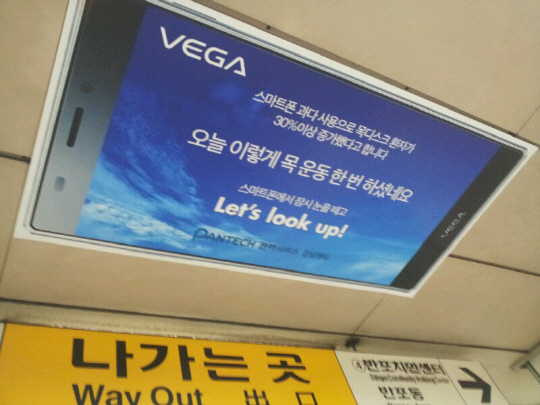 'VEGA Let's look up' 캠페인은 스마트폰 과도 사용으로 인해 목 디스크 환자가 증가하는 상황에서 VEGA가 스마트폰 사용자의 목 건강을 위해 기획한 목 스트레칭 캠페인으로, 지난 6월 5일과 7일, 11일 총 3일간 진행되었다. 유동인구가 많은 신논현역, 신촌역 등 15곳의 지하철 역사의 바닥에 '위를 보지 마시오'라는 표식을 붙여놓고, 이를 의아하게 여긴 사람들이 위를 올려다 보았을 때 천장에 부착된 'Let's look up' 캠페인의 취지를 설명하는 광고판을 보게 되도록 기획되었다. 천장에는 "오늘 이렇게 목 운동 한 번 하셨네요. 스마트 폰에서 잠시 눈을 떼고 Let's look up!"이라는 문구가 쓰여 있었다.