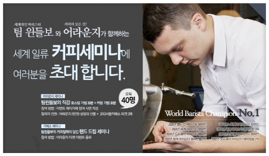 이번 세미나를 주최하는 어라운지 관계자는 "'커피 체험형 복합 문화 공간'을 표방하는 어라운지와 세계적인 바리스타 팀윈들보가 함께하는 이번 세미나를 통해 국내 커피관계자들에게 커피 관련 기술은 물론 스타 바리스타와 함께하는 특별한 경험을 선사하고자 이번 세미나를 기획했다."고 밝혔다.