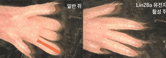 연구진에 따르면, 'Lin28a'를 활성화한 생쥐의 회복능력이 일반 생쥐보다 빠른 것으로 나타났다. 덧붙여 "생쥐의 털을 깎은 뒤 3주간 관찰한 결과 이 같은 사실을 확인했으며 쥐의 발가락에 난 상처 역시 'Lin28a'를 활성화 시킨 쥐가 빨리 회복했다"고 전했다.