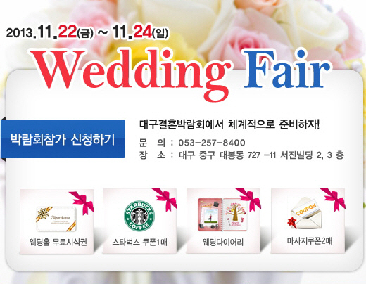 대구 중구 대봉동 727-11 서전빌딩 2, 3층에서 11월 22일부터 3일간 진행되는 이번 웨딩박람회는 대구 결혼박람회 홈페이지(http://weddfair.co.kr)와 대구 웨딩협회 홈페이지(www.wedd.co.kr)에서 사전 신청 후 무료로 참여할 수 있다.