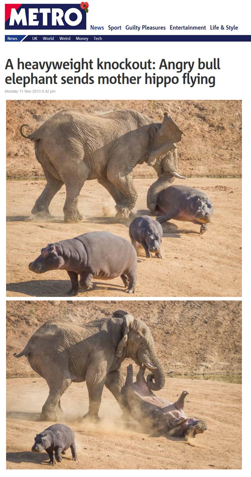 당시 코끼리가 하마 새끼들 쪽으로 다가가자 어미 하마가 달려와 몸을 던졌다는 것.