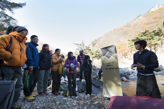 | 고어코리아가 후원하는 '볼더링 페스티벌 1st 진안 세션'에서 참가자들이 클리닉 수업을 듣고 있다. |