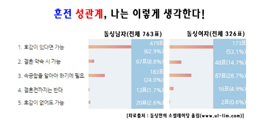 돌싱만의 소셜데이팅 울림(www.ul-lim.com)에서는 돌싱남녀 1098명(남 763명, 여 326명)을 대상으로 '혼전 성관계에 대해서 어떻게 생각하세요?'라는 설문조사를 실시했다.