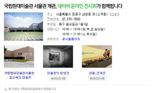 국립현대미술관 서울관이 11월 13일 개관한다. 네이버㈜(대표이사 사장 김상헌)는 국립현대미술관의 서울관 개관과 함께 마련된 5개 주제의 특별 전시를 네이버에서도 동시 제공키로 했다.