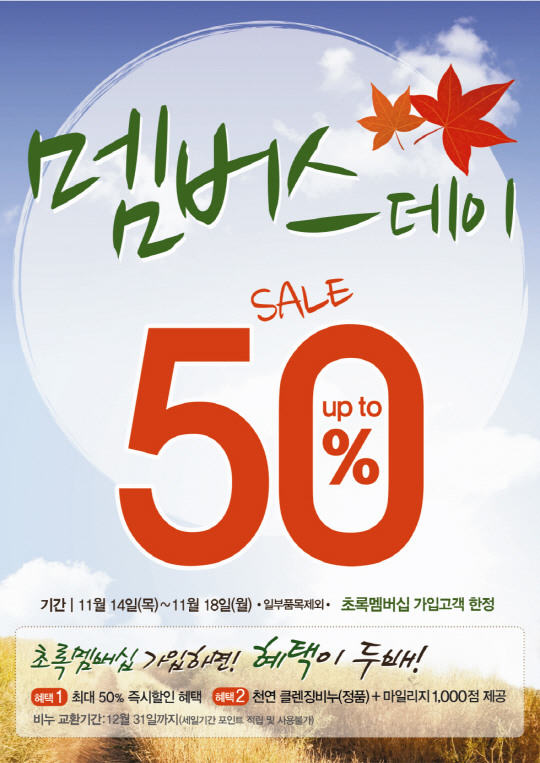 청정 자연에서 온 뷰티에너지를 전하는 화장품 브랜드 네이처리퍼블릭(대표 정운호)은 초겨울 추위로 탄력이 떨어지고 푸석해진 피부 관리를 돕기 위해 14일부터 5일간 온-오프라인에서 초록 멤버십 회원을 대상으로 제품을 최대 50% 할인 판매하는 '네이처 멤버스데이'를 실시한다고 밝혔다.