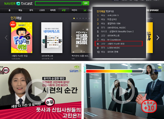온라인 취업포털 사람인의 'Fun한 취업 동영상'이 구직자와 사회초년생의 큰 공감을 얻으며 네이버 TV캐스트 전체 인기채널 TOP 10(11월 5일 기준)에 등극했다. 또, 각각의 동영상이 교양 카테고리 내 1위에 다수 기록되는 등 인기를 끌고 있다.
