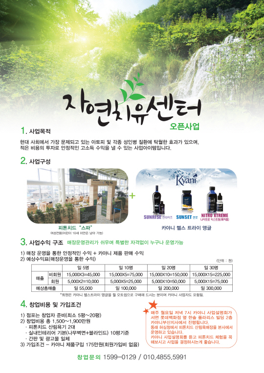 이성수 대표는 "자연치유센터에 관심갖는 고객들이 많아졌다" 면서 "자연치유센터는 소자본으로 창업도 가능하기 때문에 창업 문의가 늘고 있는 것 같다"고 말했다
