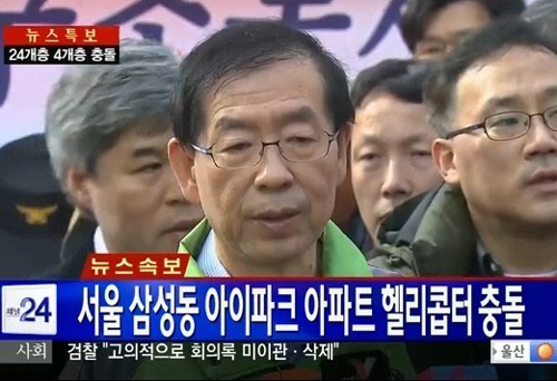 박원순 서울시장은 16일 오후 서울 강남구 삼성동 아이파크아파트의 헬기 충돌 현장에 도착해 사고 조사 및 수습 현황을 둘러봤다.